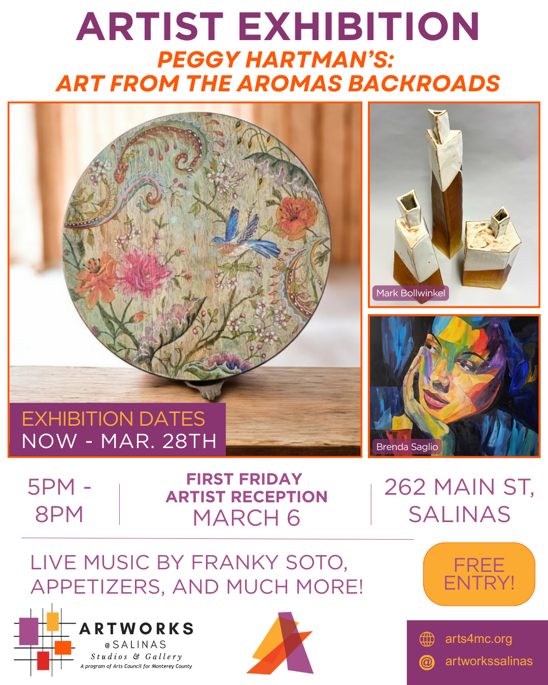 ArtWorks @Salinas is proud to kick off the year with an expansive exhibit running from January 2 through March 28, 2026. This curated collection brings together the quiet, rural beauty of the Central Coast with the ancient tradition of ceramic artistry, featuring self-taught artist Peggy Hartman, guest artist Mark S. Bollwinkel, and a special showcase of student ceramics from the Salinas Union High School District, alongside a rotating exhibit of resident ArtWorks artists.