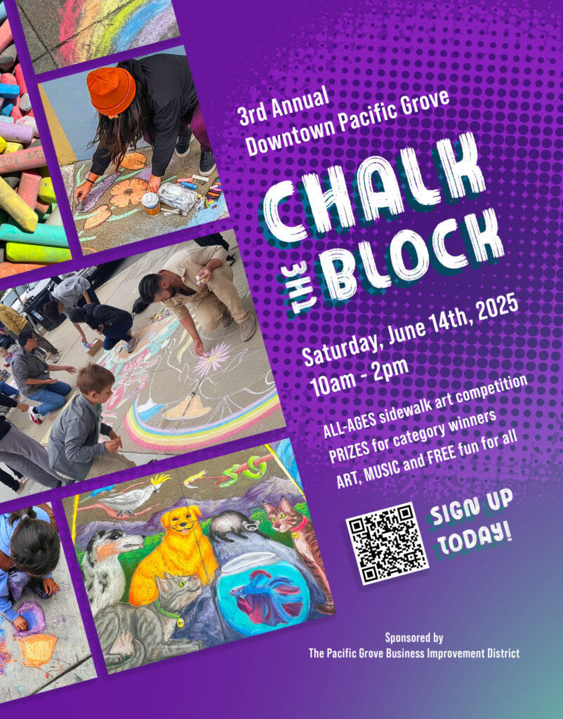 Join us for the 3rd Annual CHALK THE BLOCK in Downtown Pacific Grove, presented by the PG Downtown Business Improvement District! Whether you’re a professional artist or want to join the fun with your friends and family, all are welcome! Saturday, June 14th, 2025 10:00 am – 2:00 pm Check-in at Mechanics Bank Plaza on Lighthouse Avenue (map) Registration is required as space is limited You will be provided eco-friendly chalk to use, but you can also bring your own non-toxic supplies, too! Teams of artists are encouraged (no more than 4 people), but individual artists are more than welcome. Compete for category prizes or just for fun! The theme this year: “Love is…”