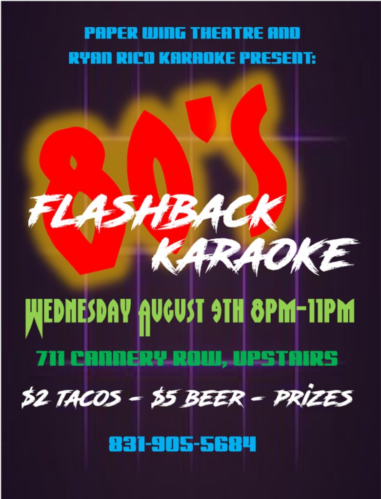 Hop in your DeLorean and head down to Paper Wing Theatre on Cannery Row for a night of 80s fun! We are serving up food, like our signature $2 street tacos and drink specials ($5 beers anyone?). Sing a song from the 1980s and get entered for raffle prizes or tempt your fate on our 80’s roulette wheel to win instantly! Gather your friends, we can’t wait to see you there!!