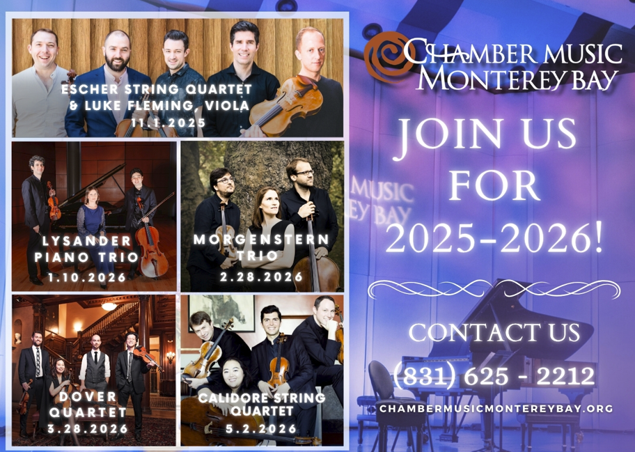 Chamber Music Monterey Bay (CMMB) announces its 59th season, presenting five evening concerts by world-class ensembles at the historic Sunset Center in Carmel-by-the-Sea. Concerts will be held on Saturdays at 7:30 p.m., preceded by complimentary pre-concert lectures at 6:30 p.m., offering audiences deeper engagement with the repertoire and performers. The 2025–2026 season continues CMMB’s mission to enrich the cultural life of the Central Coast by presenting exceptional chamber music performances, commissioning new works, and supporting community education and outreach initiatives. This season reflects CMMB’s dual commitment to preserving the legacy of chamber music while advancing its evolution through contemporary voices. CONCERT III Morgenstern Trio Saturday, February 28, 2026 | 7:30 p.m. | Sunset Center, Carmel Free pre-concert lecture at 6:30 p.m. Germany’s Morgenstern Trio, celebrated for their “breathtaking virtuosity” (Kleine Zeitung), brings a thoughtful and diverse program featuring lyrical tradition and modernist intensity. Ludwig van Beethoven – Piano Trio in C Minor, Op. 1, No. 3 Frank Martin – Trio on Irish Folk Tunes Arnold Schoenberg, trans. Steuermann – Verklärte Nacht, Op. 4 This performance spans the expressive spectrum of the piano trio form, from Classical structure to emotionally expansive modernism. TICKETS AND ACCESS Season subscriptions and individual concert tickets are available now at www.chambermusicmontereybay.org or by calling (831) 625-2212. CMMB’s Kids Up Front & Free! program welcomes students in grades 3–12 to experience professional performances from premium center seats at no cost, fostering a lifelong appreciation for chamber music. Accessible seating, pre-concert talks, and printed program notes are provided at every performance to deepen audience experience and inclusion. About Chamber Music Monterey Bay Founded in 1966, Chamber Music Monterey Bay is a 501(c)(3) nonprofit dedicated to presenting a world-class concert series, commissioning new works, and offering education and outreach that makes chamber music accessible to diverse communities. Its programming reflects a commitment to artistic excellence, cultural stewardship, and education for audiences of all ages.