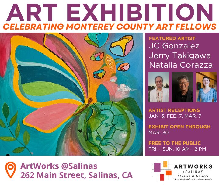 This last Artist Reception will be held on Friday, March 7th, at 5 PM, during Downtown Salinas’ 1st Friday Art Walk event. This exciting exhibit showcases the incredible work of 3 California Arts Council Individual Artist Fellowship recipients, including JC Gonzalez, Jerry Takigawa, and Natalia Poehner Corazza. Enjoy live music, small bites, and the opportunity to meet the artists and see their inspiring pieces up close. Take the chance to see the artist studios of Shagufta Khan, Emerald McColey, Edge Lorenzo, Deborah Good, Kenji Tanner, Nate Stapleton, and Victoria Lee plus crafts from local artisans! The exhibit run will run through March 30, 2025.