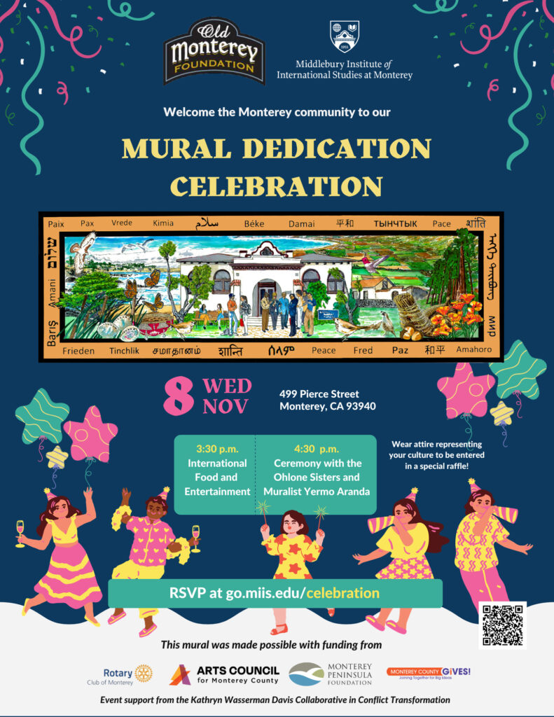 The mural, designed by Yermo Aranda, is located on the Monterey Path of History and highlights how the Institute’s history is intertwined with that of downtown Monterey and the region. It features a view of the Bay and agricultural fields to highlight the interdependence of people and the land. The current campus is located on the ancestral land of the Rumsien Ohlone and Esselen indigenous people, with traditional basketry and tule boats depicted in the mural, as well as acorns, an important food source. This project has been in the works since 2021 with support from the Old Monterey Foundation. This local nonprofit works to support and enhance the artistic, cultural, and historic environment of downtown Monterey.