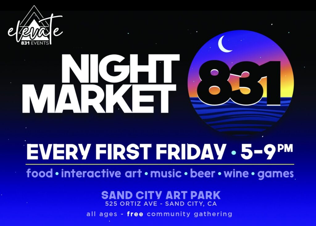 Inspired by the vibrant open-air street bazaars from around the world, Night Market 831 is a lively gathering where friends and families can sip, savor, socialize, dance, shop, and explore. Held in the colorful Sand City Art Park, surrounded by stunning murals, the market creates a unique and inviting atmosphere. We are committed to fostering a safe, fun, and inclusive community space, featuring a rotating lineup of local performers, creatives, and entrepreneurs who bring their talents to life on the first Friday of every month. Free and All Ages! Visit www.nightmarket831.com for more information.
