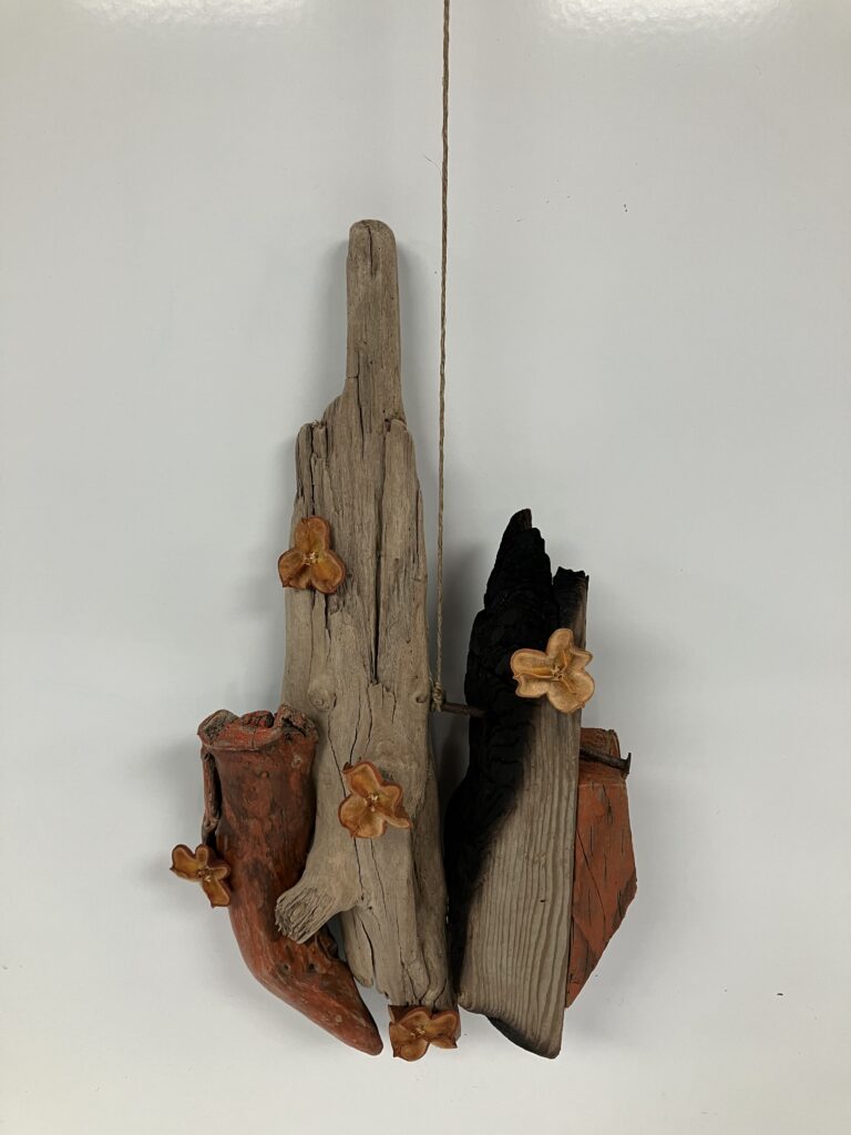 Rooted in the landscapes and histories of California’s shores, Tethered Light transforms weathered, fire-marked and ocean-worn wood into expressive sculptural forms that speak to environmental change, endurance and renewal. Many of the materials used in the exhibition were collected from beaches where wildfire-scarred trees met the sea, carrying visible traces of both destruction and survival.