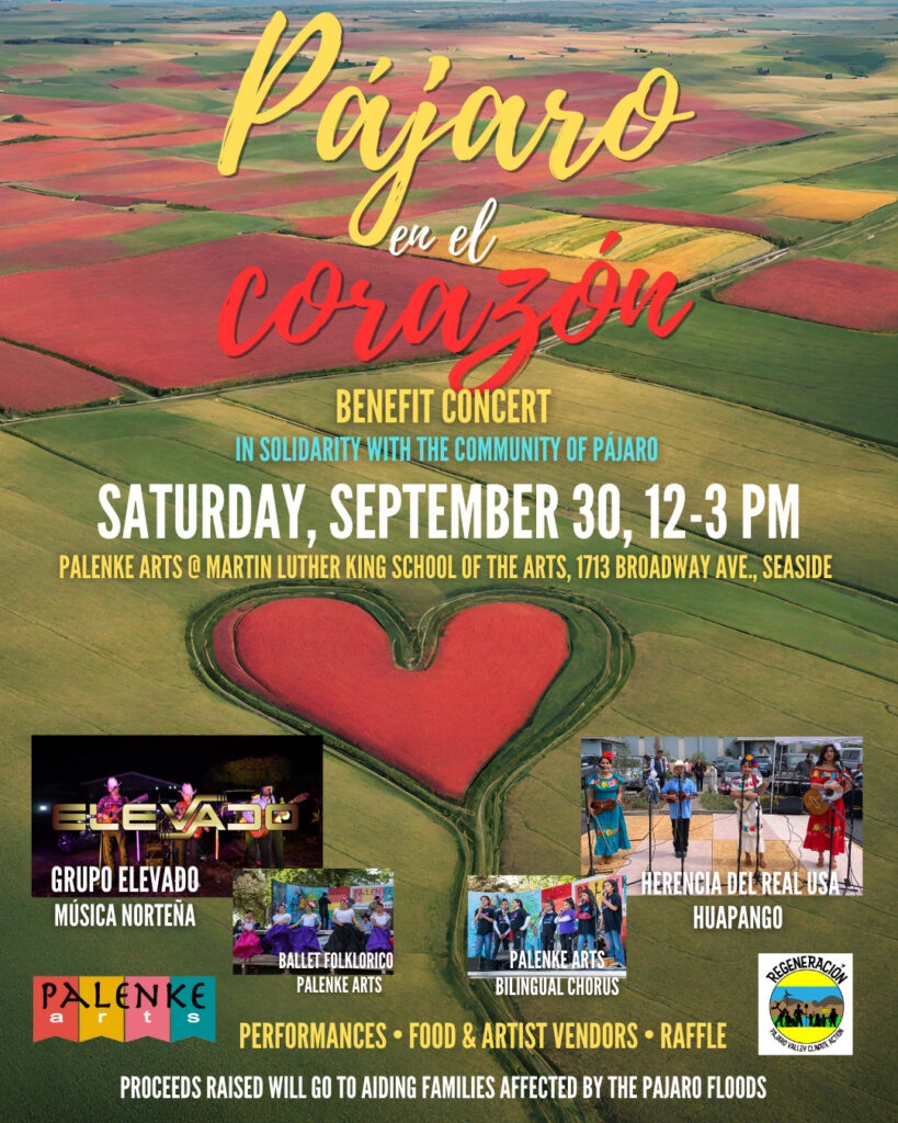 We are proud to announce, in collaboration with Regeneración, Pájaro Valley Climate Action, Pájaro en el Corazón (Pájaro in our hearts) a benefit event to raise funding for families affected by the Pájaro floods. We will have performances by Grupo Elevado (Norteño music), Herencia del Real USA (huapango music) and of course our own Palenke Arts Ballet Folklórico and Bilingual Chorus. We have a growing number of participants and will continue to update you with our performers and vendors for the event.
