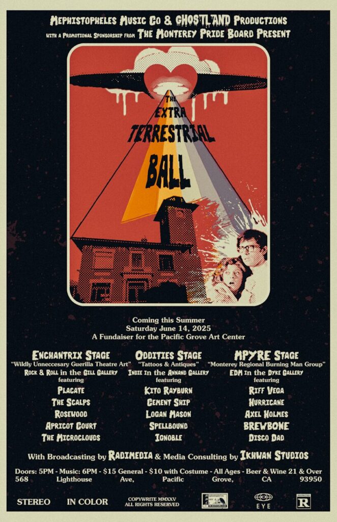 THE EXTRA TERRESTRIAL BALL – SATURDAY, JUNE 14th At the P.G. Art Center Doors at 5pm, music at 6pm. Calling the glam, the groovy, and the patrons of arts! Join us for THE EXTRA TERRESTRIAL BALL hosted by Mephistopheles Music Co. This fundraiser for the Pacific Grove Art Center will support their goal of upgrading equipment and art supplies. As we are drawing inspiration from the 60’s art-pop movement, 70’s glam, and the New York club kid scene, we highly encourage dressing up in costume! Rock out at the Enchantrix Stage (Gill Gallery), enjoy indie and acoustic sets at the Oddities Stage (Annand Gallery) and dance with DJs at the MPYRE party (Dyke Gallery)! Thank you to our sponsors – Monterey Pride, Radimedia, and Ikhwan Studios for making this event possible! All Ages | Beer & Wine bar Tickets at door – $15 general admission, $10 for costumed attendees